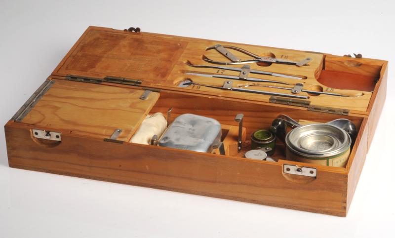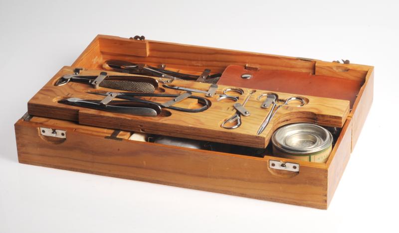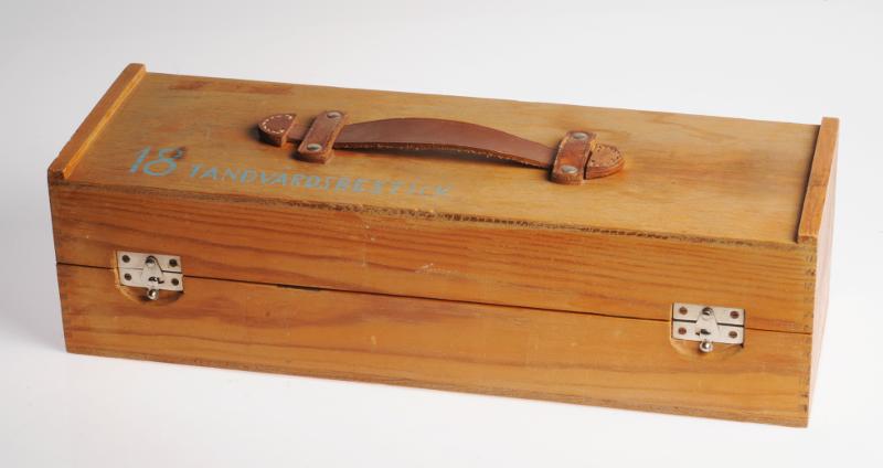 H 1391. Tandvårdsbestick i trälåda med läderhandtag.