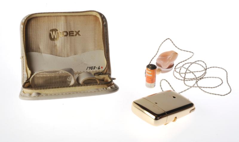 a. Hörapparat med rosa öronmussla samt guldfärgat batterietui. 2 st. Märke: Widex, Danmark. L 6 cm, B 4 cm (etui)