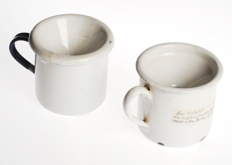 H 1799. Spottkopp. 2 stycken. Har tillhört fru Ingeborg Paulsson, Kågeröd. Skänkta av fru Hyllner, Helsingborg. Av emalj som dock är avskavd på ett flertal ställen. a) Mugg eller kopp. Av vit emalj med blå övre kant med handtag, H 8 cm Diam 8,2 cm. Märkt: "KOCKUMS SWEDEN 8 cm" samt en av muggarna märkt: "Olofström SWEDEN 8 cm". b) Tilllsats att sätta på koppen. H 3,4 cm Diam 9,2 cm. 1 st. utgår 2013-06-28.