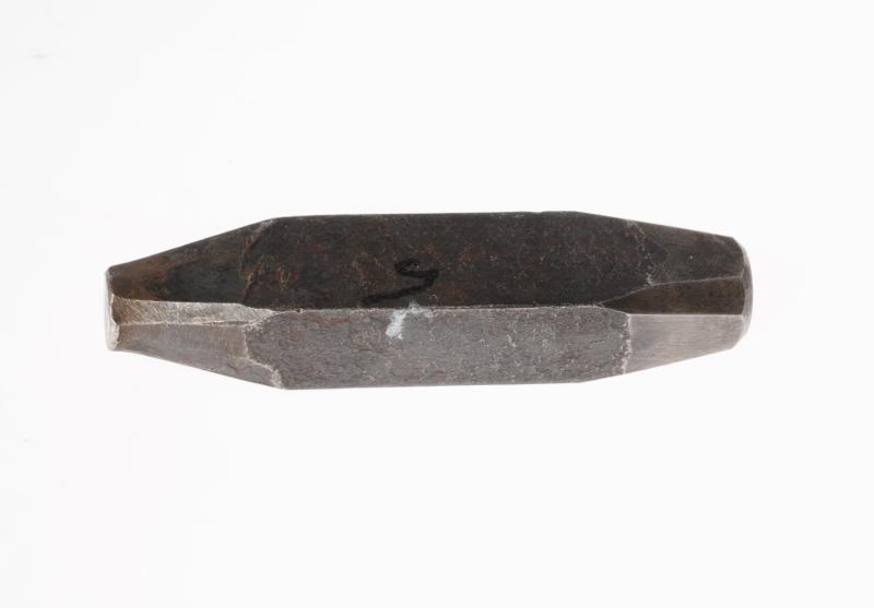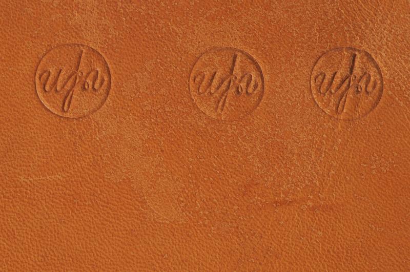 H 2104. a) Stans-signatur. Slogs in på proteser. Av metall. Från 1910-talet. L 9,5 cm Br 1,7 cm b) Läderbit. 5 stycken. Näbbskoläder. Med inslagna signaturer. "Ufa". L 22 cm Br 12 cm.