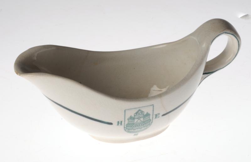 H 1681. Gräddsnipa, oval form, med handtag, vit Gustafsbergsporslin med grön dekor, en enkel rand på handtaget, samt en som löper runt snipans "buk", HSE - i grönt på ena sidan, 1 större, 1 mindre, 2 st, 1 av dem är spräckt. Den lilla modellen kantstött i själva snipen. Märkt Emil Palmgren Bosättningsmagasin Helsingborg.