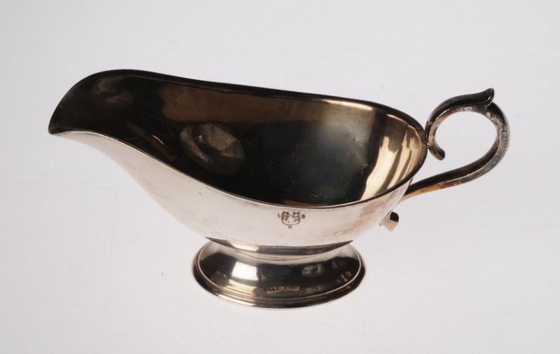 H 2135. Såsskål. 5 stycken. Av nysilver. På fot. Profilerat handtag. H 4,7 cmBr 6,6 cm L 14,5 cm. Stämplar: "ESH". Förvärvade från Epidemisjukhuset i Helsingborg. 4 st. utgår 2012-06-08.