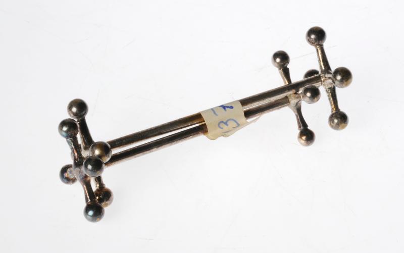 H 2137. Knivställ. 2 stycken. Av nysilver. Vilar på 4 knoppar. H 2,5 cm Br 8,1 cm. Förvärvade från Kirurgiska kliniken I, Helsingborg.