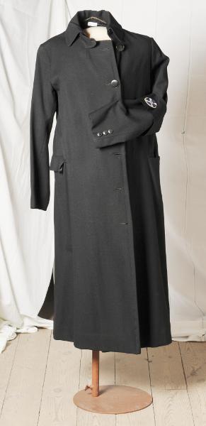 H 2246. Kappa. Av svart ylle. Enkelknäppt med 6 stora svarta knappar. Framtill 3 små svarta plastknappar på vardera ärm. Krage, slejf och motveck baktill b) Ärmbindel. Svart med vit/blått emblem "SS" [eller "SB"]. Användes av barnmorska.