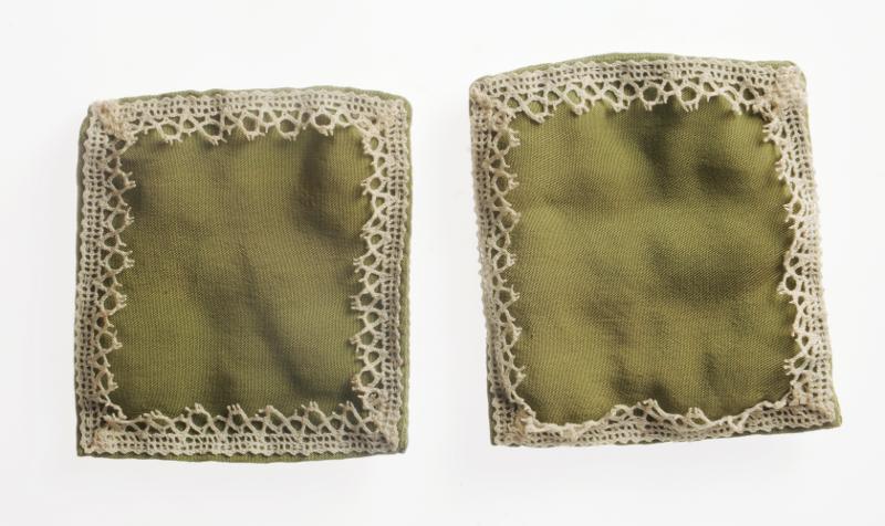 H 2867.7. A. Sängkuddar, 2 st, grönt siden med spets.