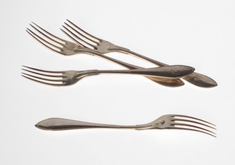 H 2879. Gafflar, 4 st, nysilver, släta, LSH-märkta, små.