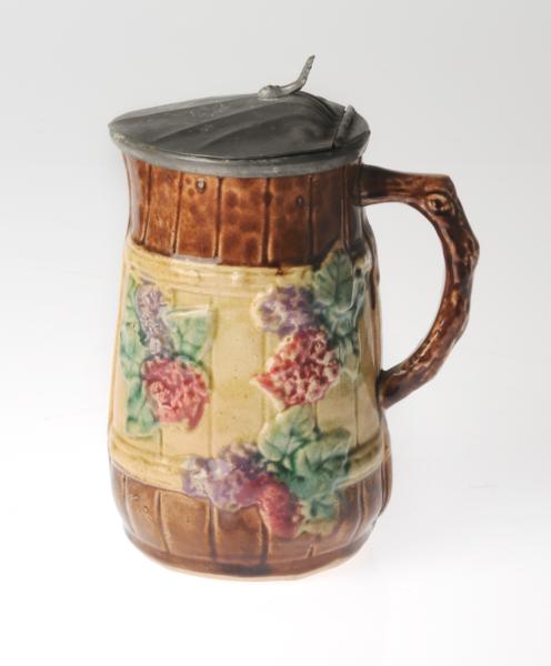 H 2374. Keramiktillbringare. Gul/brun med handtag. Utanpåliggande dekor i form av blommor, blad och vinrankor. Aluminiumlock. H 15,5 cm Diam 8,2 cm.
