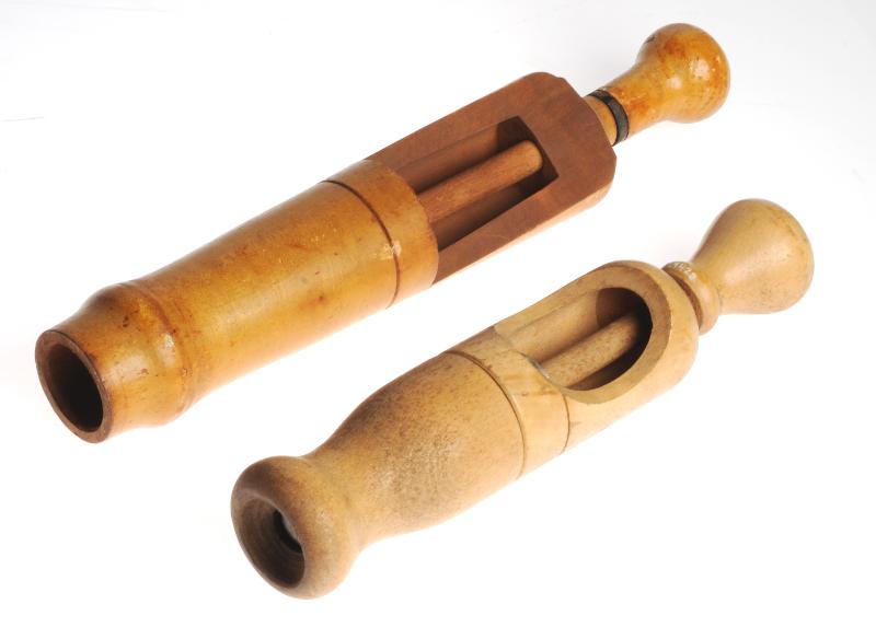 H 2942. Kryddkross, trä, 2 st. a) H 31,8 cm. b) H 25,5 cm.