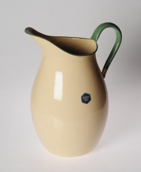 H 2453. Vattenkanna. Gulfärgad emalj med grön rand runt mynningen och grönt handtag. Tillverkare: "Kockums Ronneby Sweden". Rymmer 5½ liter. H 32 cm Diam 12,6 cm.