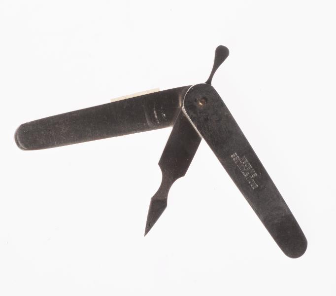 H 3036. Lancett, tillverkare Broli, rostfri stål, 2 st, för vaccination. L 6,5 cm, B 0,6 cm.