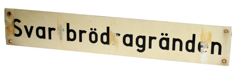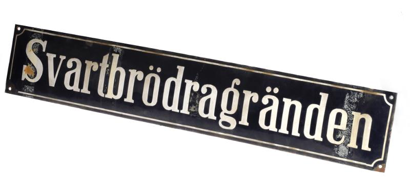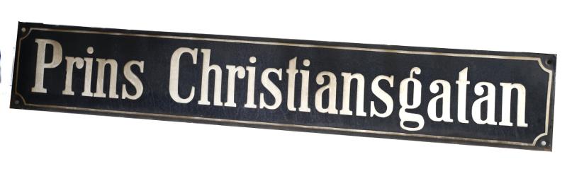 H 3560. Gatunamnsskyltar. 3 stycken. Av plåt. 2 st. blå med vit text och 1 st. vit med svart text a) Svartbrödragränden (blå) b) Prins Christiansgatan (blå) c) Svartbrödragränden (vit). a) L 73,3 cm Br 13,6 cm b) L 70,3 cm Br 12,5 cm c) L 79,5 cm Br 13 cm.