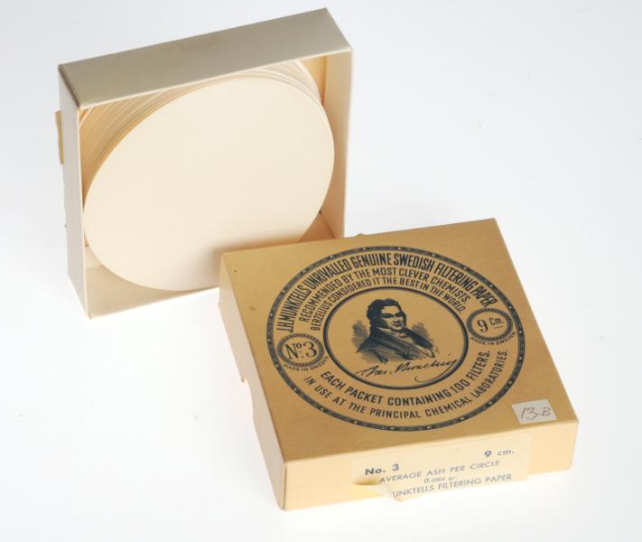 H 3745. Filterpapper. Ligger i gul pappask. 100 stycken. Fyrkantig ask med lock och svart text: "J. H. MUNKTELLS UNRIVALLED GENUINE SWEDISH FILTERING PAPER RECOMMENDED BY THE MOST CLEVER CHEMISTS BERZELIUS CONSIDERED IT THE BEST IN THE WORLD". Porträtt av en man. No 3, 9 cm. a) Lock L 10 cm Br 9,8 cm b) Ask L 9,2 cm Br 9,9 cm. För laboratoriebruk.
