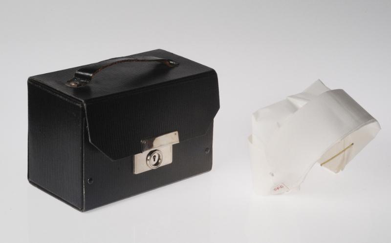 H 3834. Väska. Av svart räfflat papp med svart läderhandtag. Silverfärgat metallknäpplås. Gul-brun i locket. Text: "PUB PAUL U BERGSTRÖMS A-B STOCKHOLM". Användes vid transport av uniformsmössor. L 17,4 cm Br 9,5 cm H 11,8 cm. Skänkt av Ingrid Olsson.