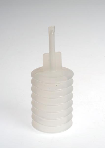 H 4158. Dränageampull. Bälgmodell. Mjölkvit/transparent plast. Rymd ca 200 ml. Förseglad pip i ena änden. Viggo. L 13,5 cm. Uppgifter om föremålet lämnade per telefon av Viggo AB den 1 sep 1988. Föremålet är troligen från tidigt 1970-tal.