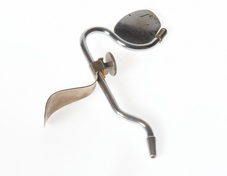 - Medium modell. Böjt rör för salivevakuering, spegelplatta överst för tunghållning samt en undre platta som med skruv ställs in efter hakmåttet. Hakplattan är märkt: "SVEDOPTER SVEDIA SWEDEN, SVEDIA OPTICAL SALIVA EJECTOR".