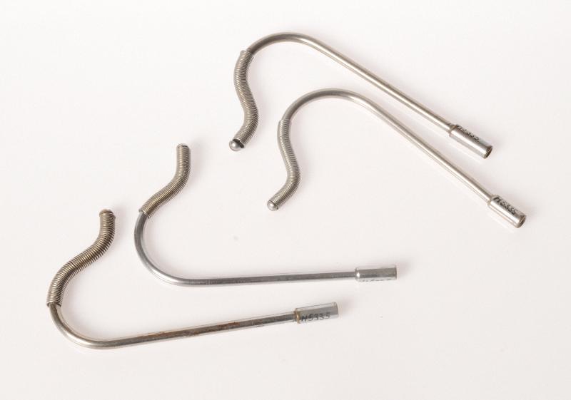 H 5335. Salivsug. 4 stycken. Av metall, med fjäder. L 102 mm Br 59 mm. Gåva från Hovtandläkare Gripwall Helsingborg.