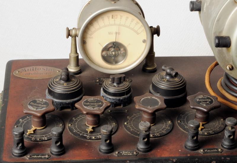 Brun rektangulär låda med uttag för endoskopi, galvanisation, faradisation och kaustik. Står på vitmålad vagn med ett modernare elsystem undertill. Ej komplett (handkontroll saknas). Omformar ledningsnätets ström till olika arter av galvanisk och faradisk ström.