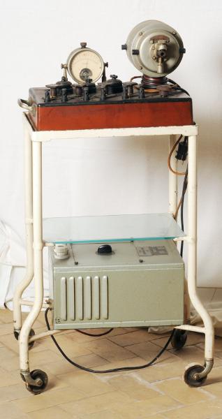 - Brun rektangulär låda med uttag för endoskopi, galvanisation, faradisation och kaustik. Står på vitmålad vagn med ett modernare elsystem undertill. Ej komplett, handkontroll saknas. Märkt med oval skylt: "Multostat erdschlussfrei". Omformar ledningsnätets ström till olika former av galvanisk och faradisk ström.