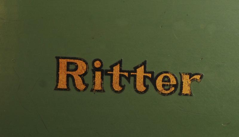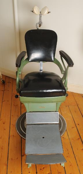 H 5423. Patientstol. "RITTER". Av metall och plast. Oljepump, dubbebelteleskopig [?]. Br 550 mm H 950 mm Gåva från Hovtandläkare Gripwall Helsingborg.
