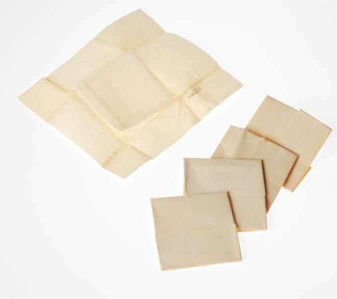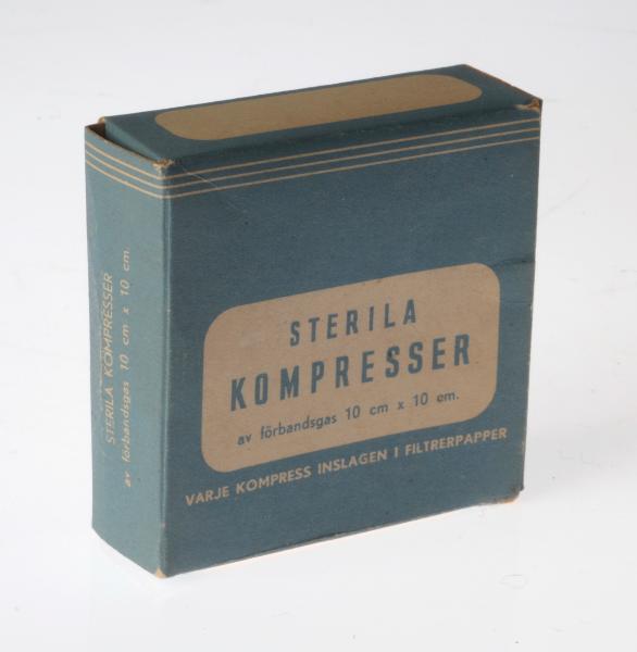 H 4126. Kompresser i förpackning. a) Kompressförpackning. 4 stycken. Blågrå/vit pappask. L/B 6,1 cm b) Kompress. 31 stycken. 10 x 10 cm. Steril i vitt pappersomslag. L 5,7 cm.