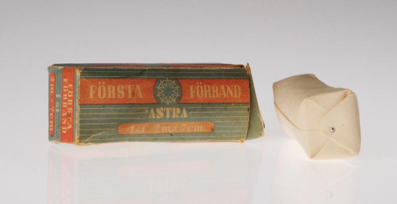 H 4130. Första förband. 2 m x 7 cm a) I vitt pappersomslag b) I ljusblå/röd pappask med vit text: "ASTRA". L 7,5 cm.