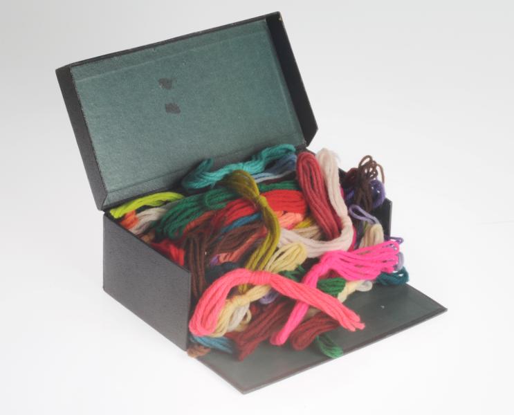 H 3419. Färgsinnesprov, använt 1890-1900, ligger i svart utvikbar ask, div. olika garnbitar i bl.a blått, orange, rosa, brunt, grönt, turkos, apelsingul, citrongul, vit, ljusblå, ljus- och mörkröd, grå, gräsgrön m.m. 76 st (5 st märkta).
