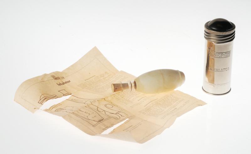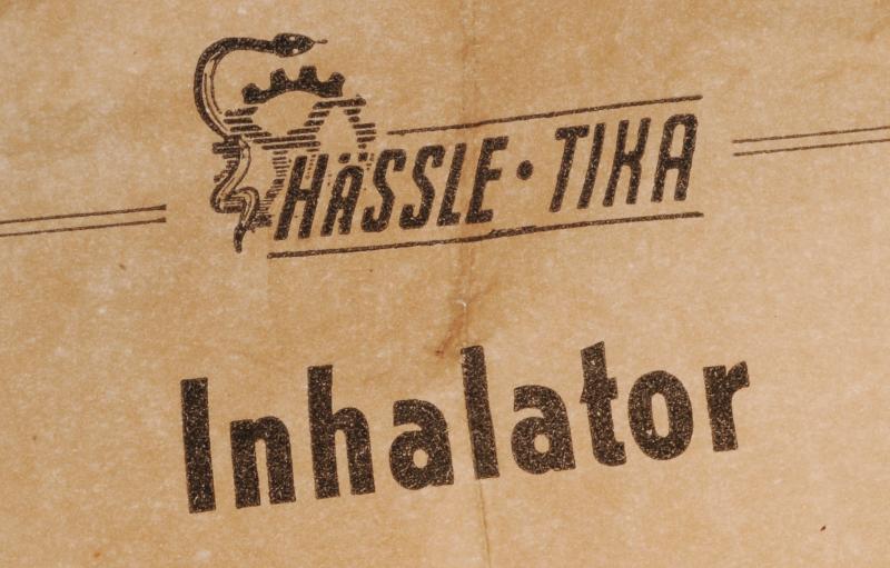 H 3441. Inhalator, glasrör med kork, omgiven av ett ovalt vitt gummi med metallplatta i botten, glasröret går att dra upp till hälften, med förvaringsetui rostfri, märkt: Hässle-Tika Inhalator schweizisk tillverkning, inåtgående rundad botten, med skruvlock med räfflad kant och randig sida, bruksanvisning rosa papper på svenska, franska, tyska.