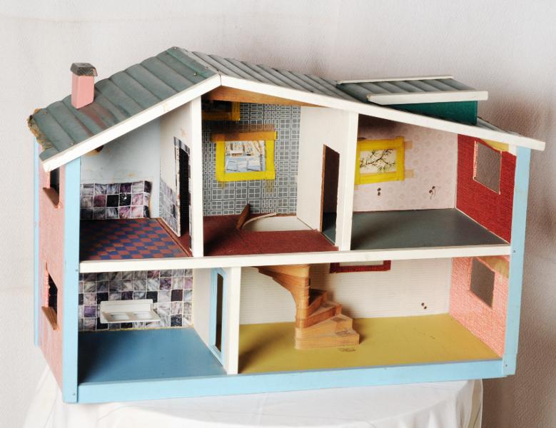 H 3856. Dockhus. Två våningar. 5 rum. Av trä. Trappa emellan (spiral) våningarna. Tegelstensbaksida. Olika tapeter. Några "tavlor" är uppsatta. Sluttande tak med skorsten. Tillverkare Micki leksaker AB, Gemla. Inga inventarier. L 66,5 cm Br 28,8 cm H 45 cm.