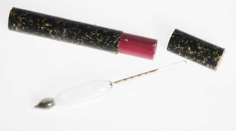H 3933. a)-b) Fodral. Av papp. Klätt med mönstrat papper (grönt + svart). Hör till H 3933 c). L 17,5 cm c) Urinometer. Urinprober. Dr Vogel. Graderad 1000-1025. L 16 cm.