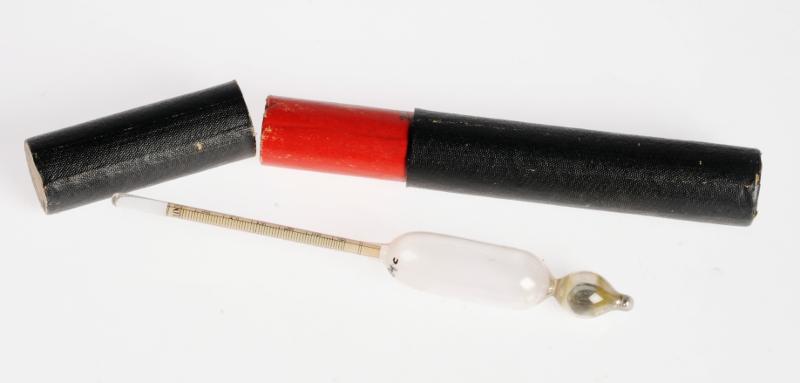 H 3934. a)-b) Fodral. Av papp. Klätt med svart papper. Invändigt rött. L 17 cm c) Urinoneter. Graderad 1000/10-60. L 16 cm.