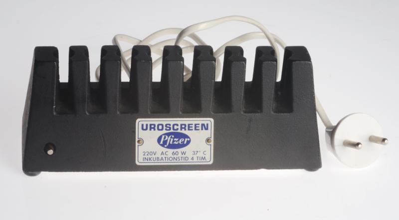 - Svart, kompakt ställ med 8 urgröpningar för provrör med urin. Vit sladd och kontakt. På framsidan rektangulär, silverfärgad metallbricka med blå text: "UROSCREEN Pfizer 220 V AC 60 37 ̊ C Inkubationstid 4 tim."