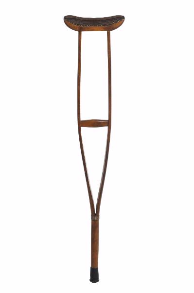 VS 130. Krycka av cellulosalackerat trä mm. L. 1175, B. 250x40. Armhålstödet klätt med brunrandigt möbeltyg. Spolformat handtag. Metallring, B. 20 mm. Svart gummifot.