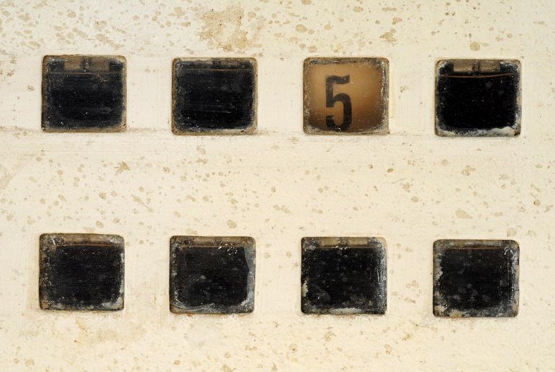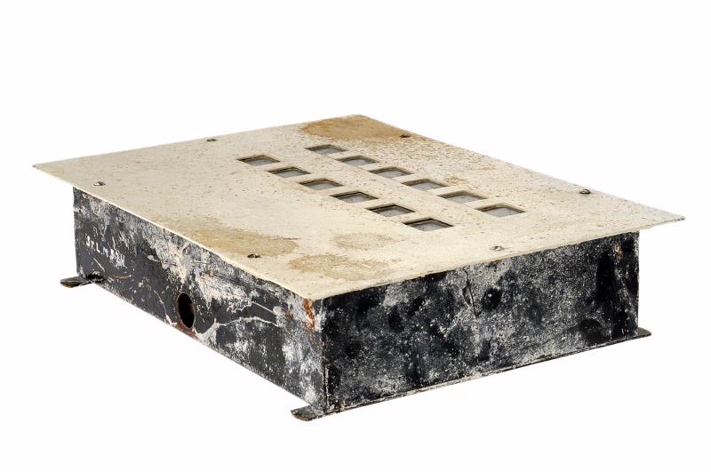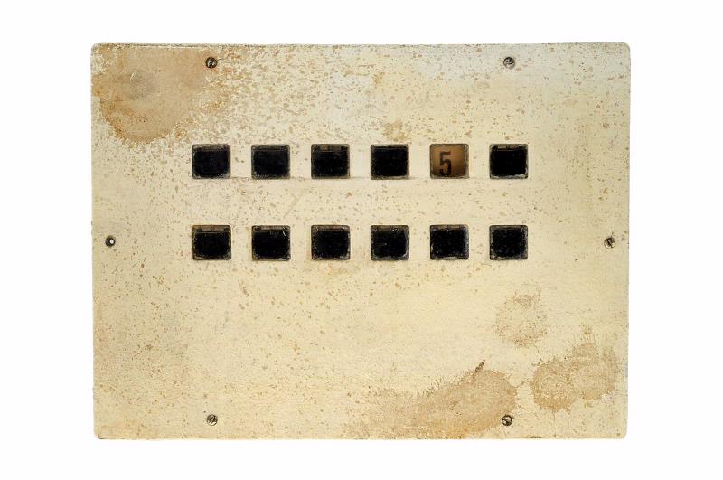 STLM 524. Alarmklocka. L. 22 cm B. 30cm D. 6 cm. Alarmklocka för vägg gjord av metall med 12 st larmnummer.