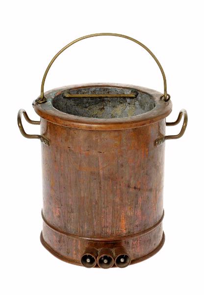 VS 166. Limpotta av koppar, 2-delad, el-värmd. Total höjd 225, diam. 196. Insatsen/limbehållaren: H. 130, med utvikt överkant och mässingsbygel till handtag. Värmehållaren har 2 mässningshandtag och 3 runda, en-poliga eluttag. Botten märkt: "Indrustrifirman Ernst Gennel Stockholm P3 220 Volt 750 Watt".
