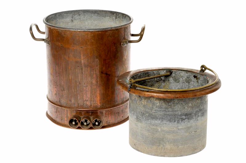 Använd på borstbinderiverkstaden. Limbehållarens bygel lagad/fastsatt med metalltråd. Värmehållarens insida kalkbelagd.