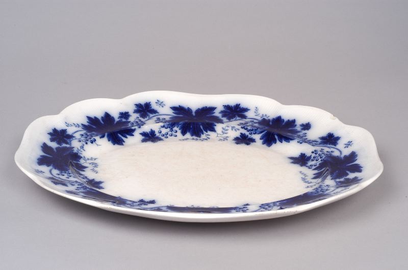 Oval form. Vågigt bräm med dekor av vinranka. Spegel odekorerad. Flintgods med koppartryck i flytande blått under glasyr.