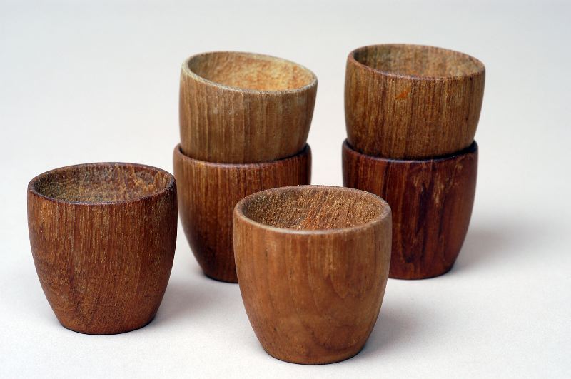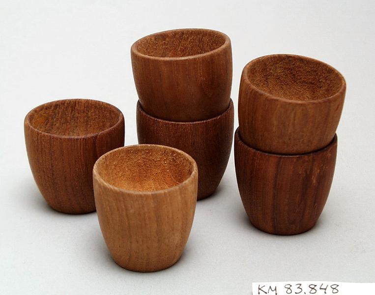 Äggformad, med plan botten och avskuren upptill. Oljad teak.