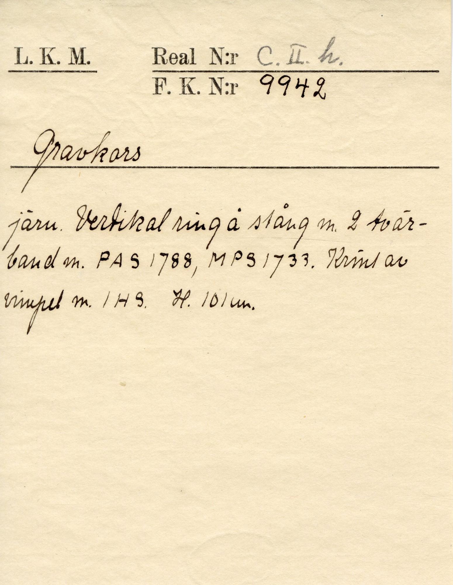 Gravkors, järn. Vertikal ring å stång m. 2 tvärband m. "PAS 1788", "MPS 1733". Krönt av vimpel m. IHS.
