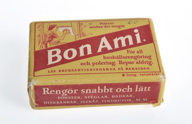 Rengöringsmedel i form av fältspatsblandat tvål. Inslagen i papper. Förpackningen gul med rött tryck, på framsidan bild av kvinna som putsar fönster samt texterna: "Polerar medan det gör rent" och "För all hushållsrengöring och polering. Repar aldrig. Läs brukanvisningarna på baksidan". Tvärs över förpackningens framsida ett rött band med ofärgad text "Bon Ami". Även långsidorna med rött band och ofärgad text: "Bon Ami För all hushållsrengöring" samt "Rengör snabbt och lätt fönster, speglar, badkar, diskbänk, isskåp, vindrutor, m.m". Med smått även (swedish) (448). Förpackningens baksida med brukanvisningar i rött mot gul botten.