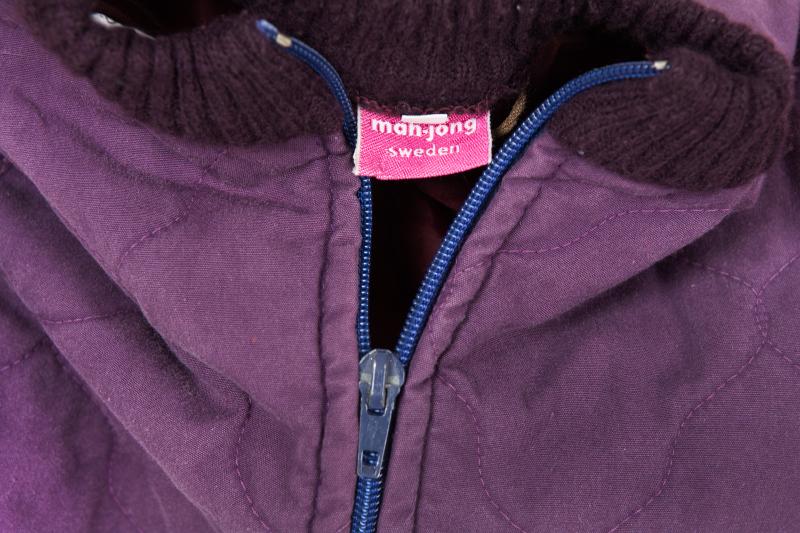 Rundhalsad jacka med gummiband i ryggen samt blixtlåsknäppning. Stickad mudd vid halsrigning och vid ärmarnas slut. Sydd av lila/purpurfärgad bomullsväv med dekorativ kviltning och fodrad med vinrött polyestertyg. Två påsydda fickor, 13x13 cm, vid jackans nederkant på var sida om blixtlåsen. Även fickorna fodrade. Upphängningshank i nacken av brunt bomullsband. Isydd etikett i nacken med texten "Mah-jong Sweden" samt på etikettens baksida produktinformation och tvättråd. Även liten vit etikett med storleksangivning 120. Givaren har själv tråcklat fast en vit märklapp med maskinbroderad text "Johan Borg" i rött.