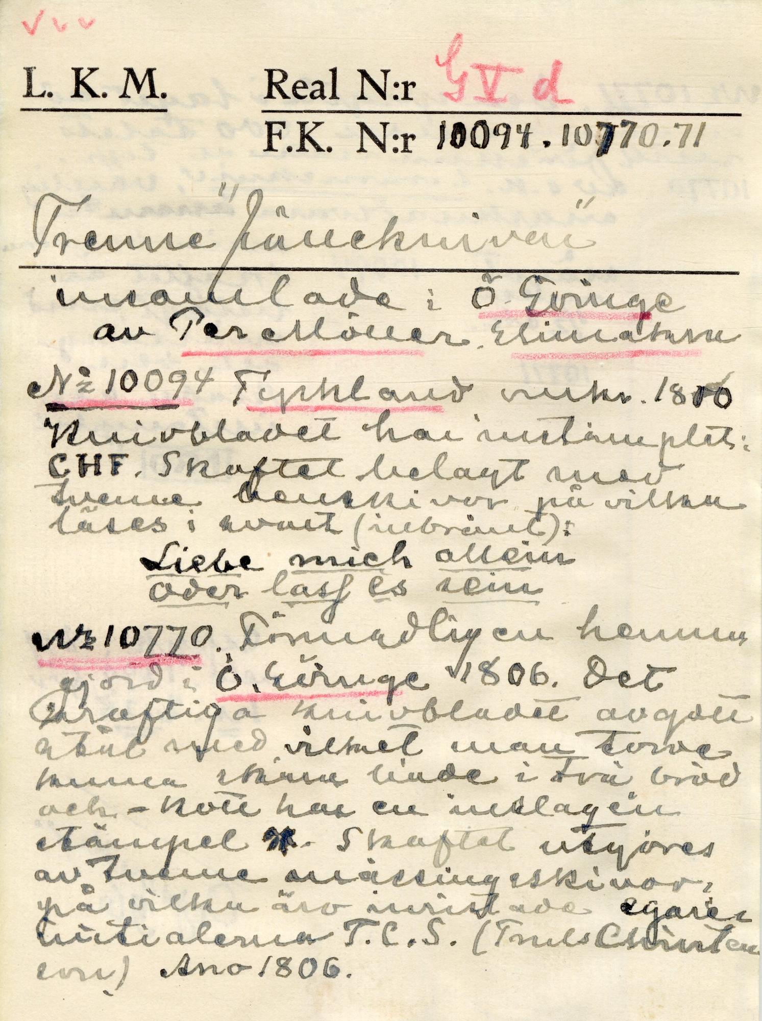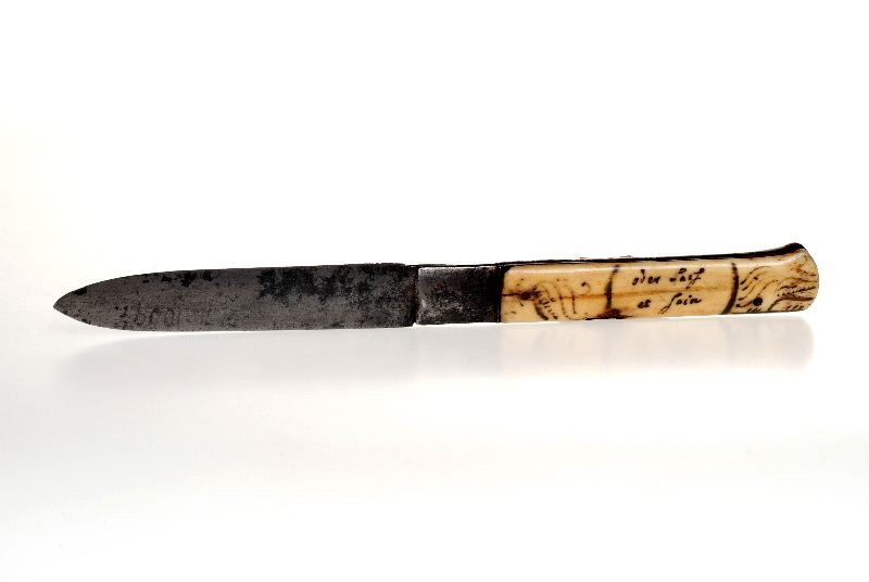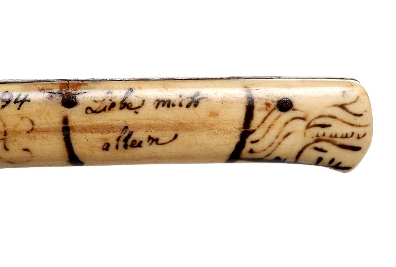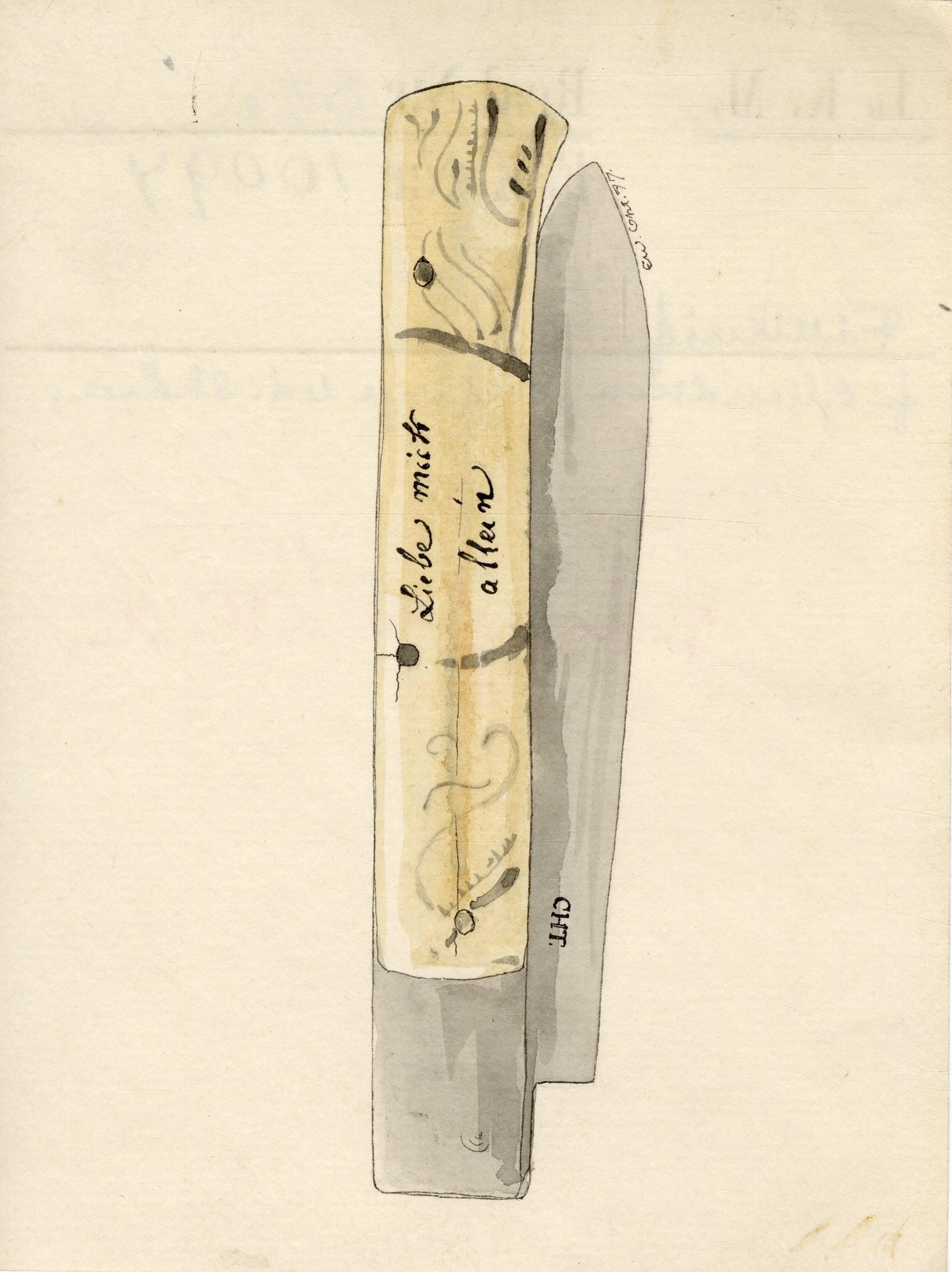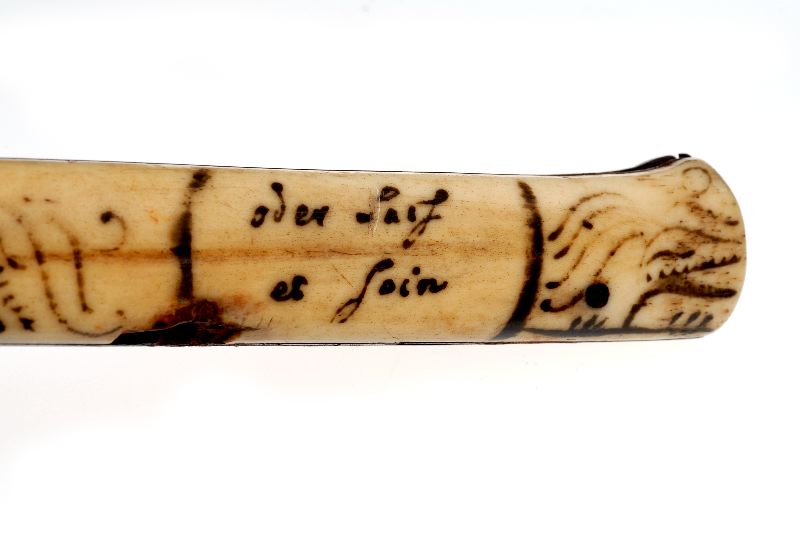 Handtaget med ristad dekor och text på båda sidor. På ena sidan: Liebe mich altern. på den andra: oder Last [oläsligt].