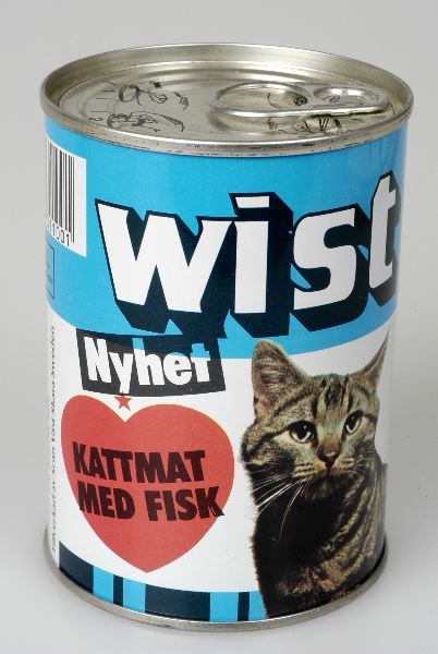 Cylindrisk burk med lock som dras av. Tryck i vitt, blått, svart, rött. Text i vitt och svart. Bild av katt.