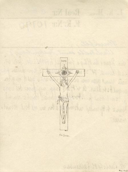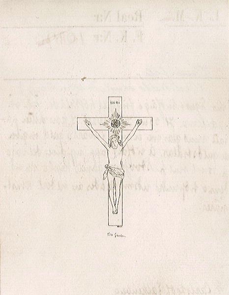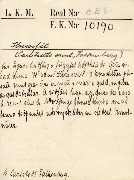 fur. Figur i hudfärg o förgyllt höftkläde, grön virad krona. H 38 cm. Kors svart. I korsmitten påsatt runt glas över en rosett i svart o guld, omgiven av guldstrålar. Å vidfäst lapp uppgives det vara fr 1500-t slut fr Stavsinge gamla kyrka som vid denna tidpunkt utsmyckades av nederl. konstnärer.