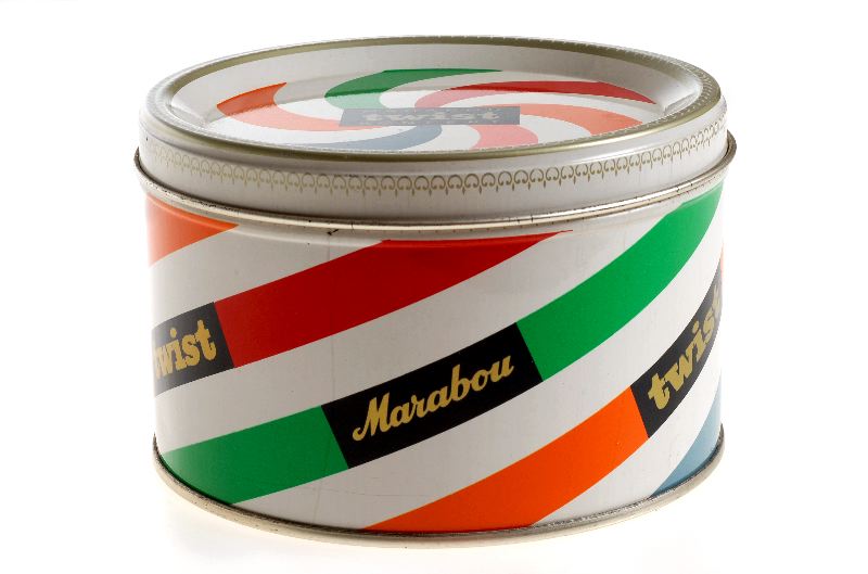 Rund med avtagbart lock, vit bakgrund med ränder i orange, rött, grönt, ljusblått och rosa, svarta rektanglar med varunamn och fabrikat angivet i guldtext.