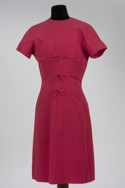 Hallonröd, figurskuren klänning med kort ärm. Bakstycket skuret vid midjan. Framstycket skuret i tre fält; ett vid bysten, ett strax ovanför midjan samt i ett rundat fält på framstyckets kjoldel. Vid varje skärning har ett blankt passpoalband sytts fast. På framstycket har varje passpoalband en rosett mitt fram. Rundad halsringning. Lång dragkedja mitt bak. Klänningen är fodrad med röd polyester. Märkt till vänster om dragkedjan med vit etikett med texten "Pierre Balmain Ready to wear by Torella" vid halsringningen på vänster axel en liten vit etikett med storleksangivelsen "36". I fodret en vit etikett med svensk text "KEMTVÄTT EJ TRI". Plagget ger intryck av att vara omsytt bland annat vid blixtlåsen.