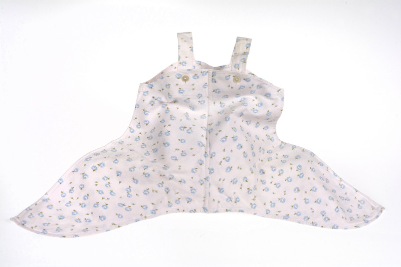 - Byxor sydda av svagt rosa bomullsflanell mönstrad med ljusblå rosor med gröna blad. Rymlig modell med två hängslen vilka knäppes med pärlemovit plastknapp på bröstlappen. Byxorna är hopsydda vid benslutet.