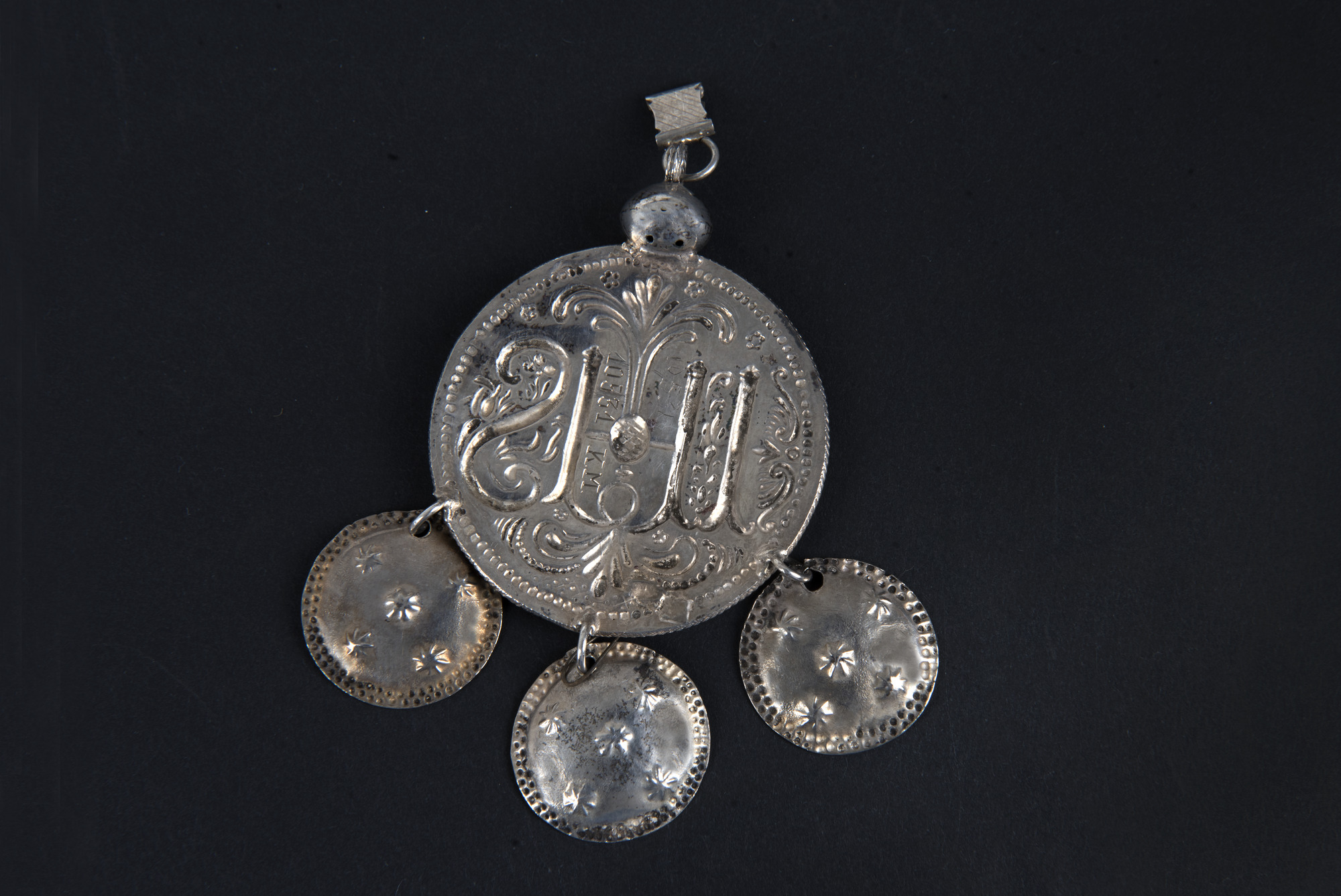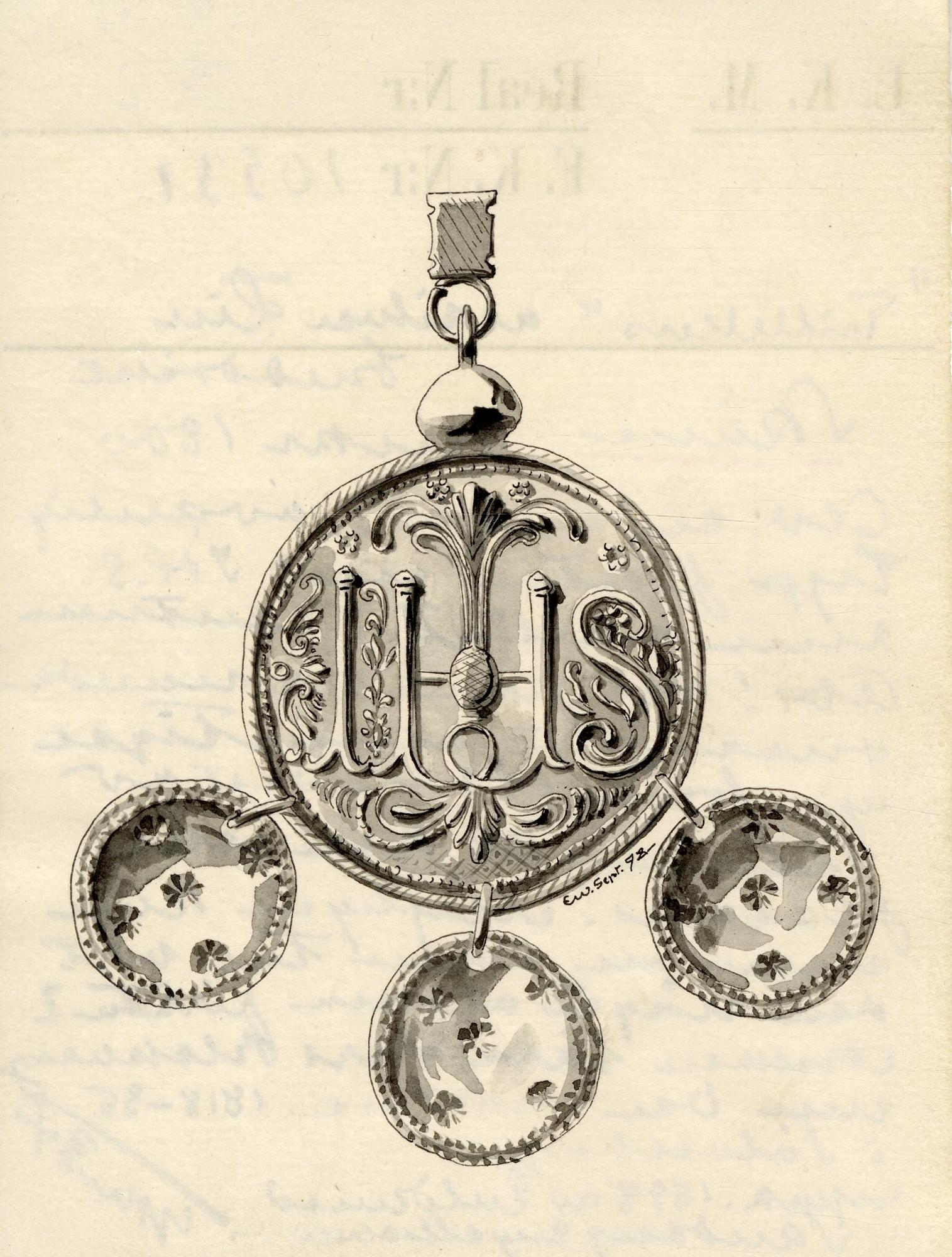 Sedvanligt IHSmonogram men med ovanlig utformning runt monogrammet. Repstav runt kanten, upptill slät kula med antydd gördel, ögla varvid en löpare är fäst. Tre förgyllda löv, alla skålade, med dubbla rader prickar runt kanten samt dekorerade med 5 stjärnor vardera.