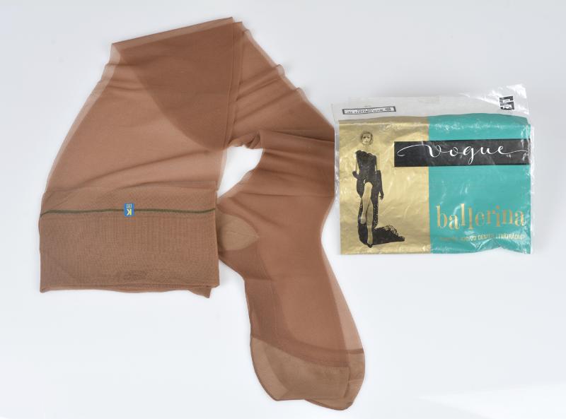 Micromeshstickade strumpor avsedda att fästas med strumpeband. Med förstärkt tå och häl. Färg, Roma 9. Oanvända i öppnad originalförpackning. Förpackning i genomskinlig plast med tryck i guld, svart, vitt och blågrönt. Dekor i form av välklädd dam som visar benen samt texten "Vouge, Ballerinna, Sömlös 420/20 denier (tvåtrådig)". På baksidan VDNs varufakta samt information om modellen Ballerina, tryckt i guld på vit bakgrund. Även märkt "Svensk textil" samt "Mild fintvätt 35 grader för hand" i svart/vitt tryck.