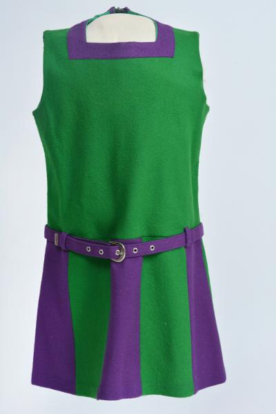 - Grönlila, ärmlös flickklänning med tillhörande skärp. Skuren vid höften. Överdelen av grön filt. Halsringningen kantad med lila filt, fyrkantigt skuren på framstycket. Kort dragkedja i nacken. Okpartiet fodrat med grön bomullsväv. Bälte av svart plastmaterial med påsydd lila filt och spänne samt med hål av vitmetall. Fyra hällor av lila filt. Kjolen randig, sydd av tio bårder, 5 gröna, 5 lila. Fållad för hand. På höger sida om dragkedjan två vita etiketter med röd text. KEMTVÄTT respektive 9/130 (storleksangivelse).