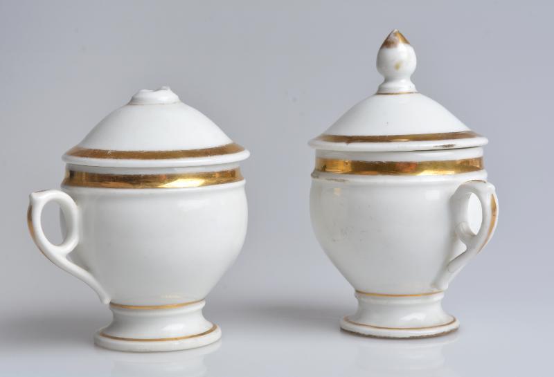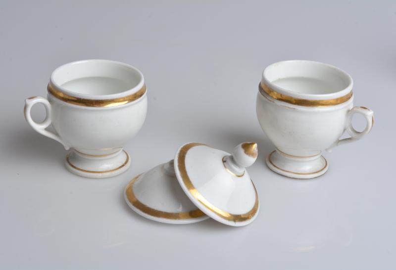 Krämkopp. Urnformad på liten fotklack, toppigt lock med spetsig knopp, en knopp avslagen. Dekor i guld. Snirklig lodgrepe som påminner om siffran nio.